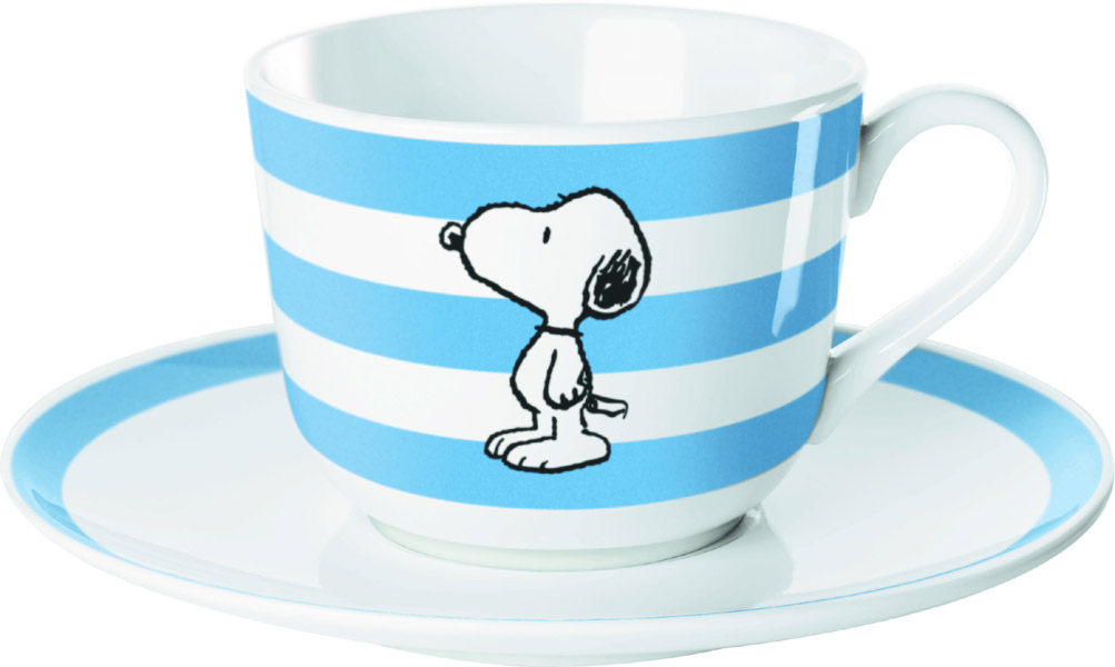Mug + Untertasse – Snoopy blau gestreifter Hintergrund